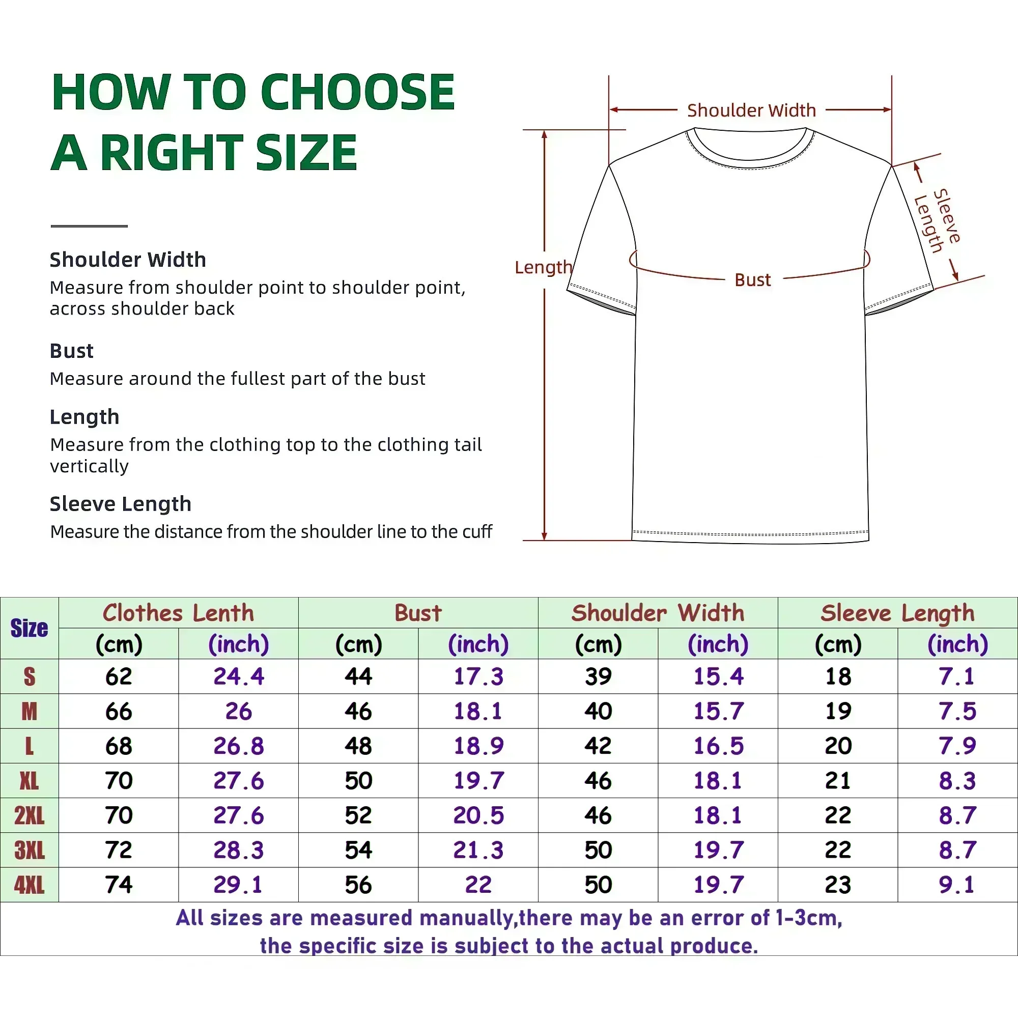 Note: Manual measurement may cause a 1-3cm size error, which does not affect the overall fit or quality.